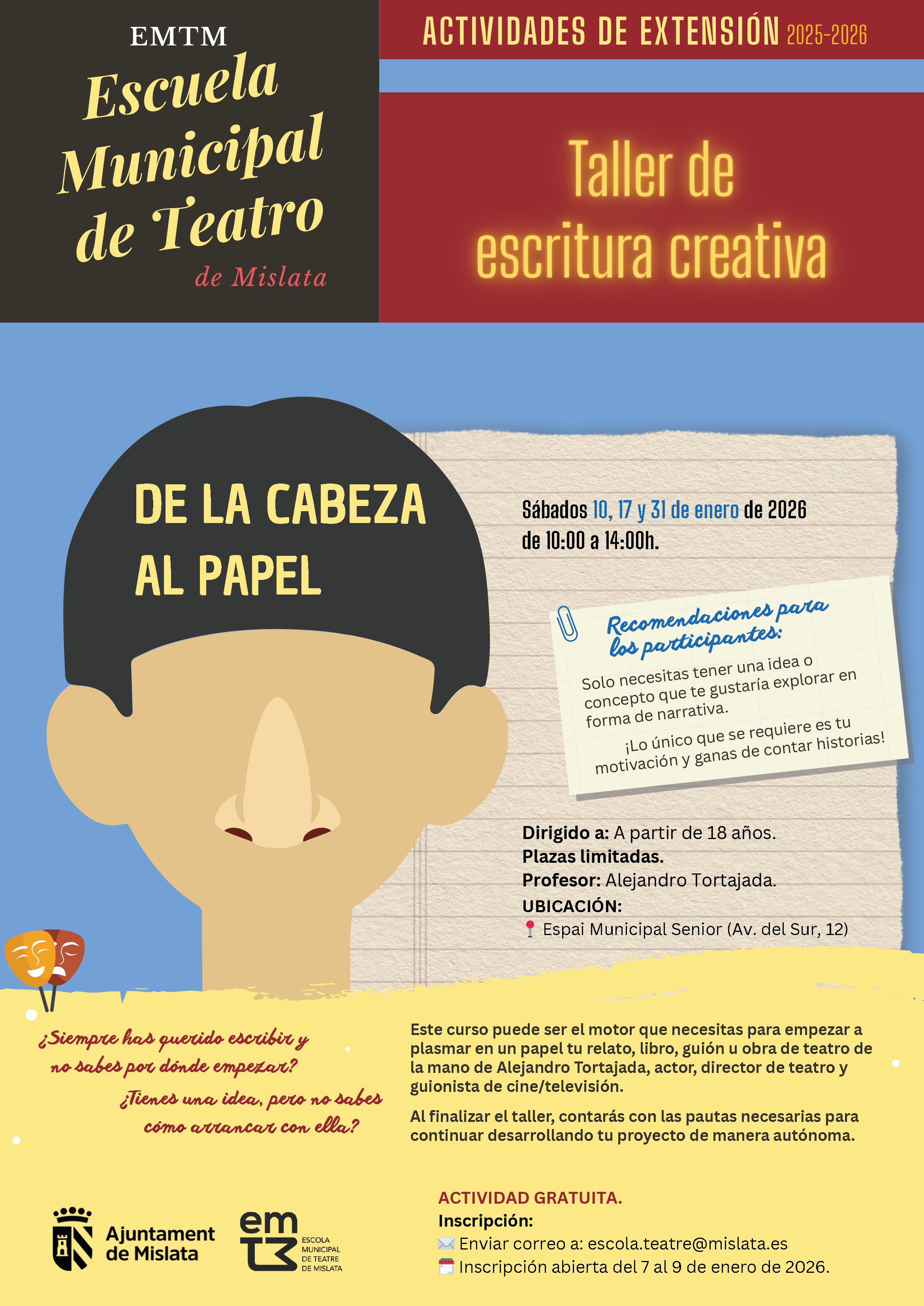 Inscripciones: del 7 al 9 de enero de 2026, a través del correo escola.teatre@mislata.es