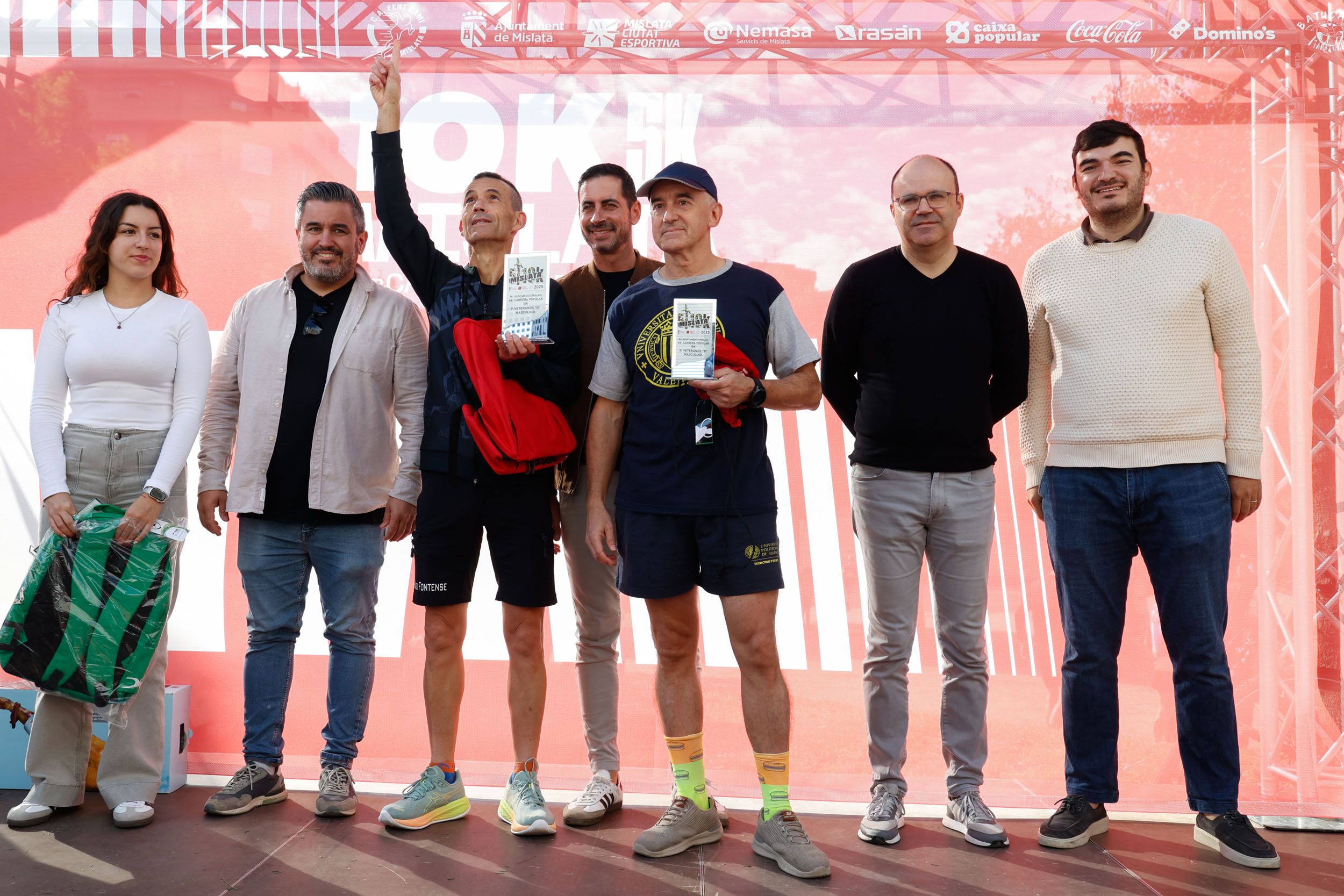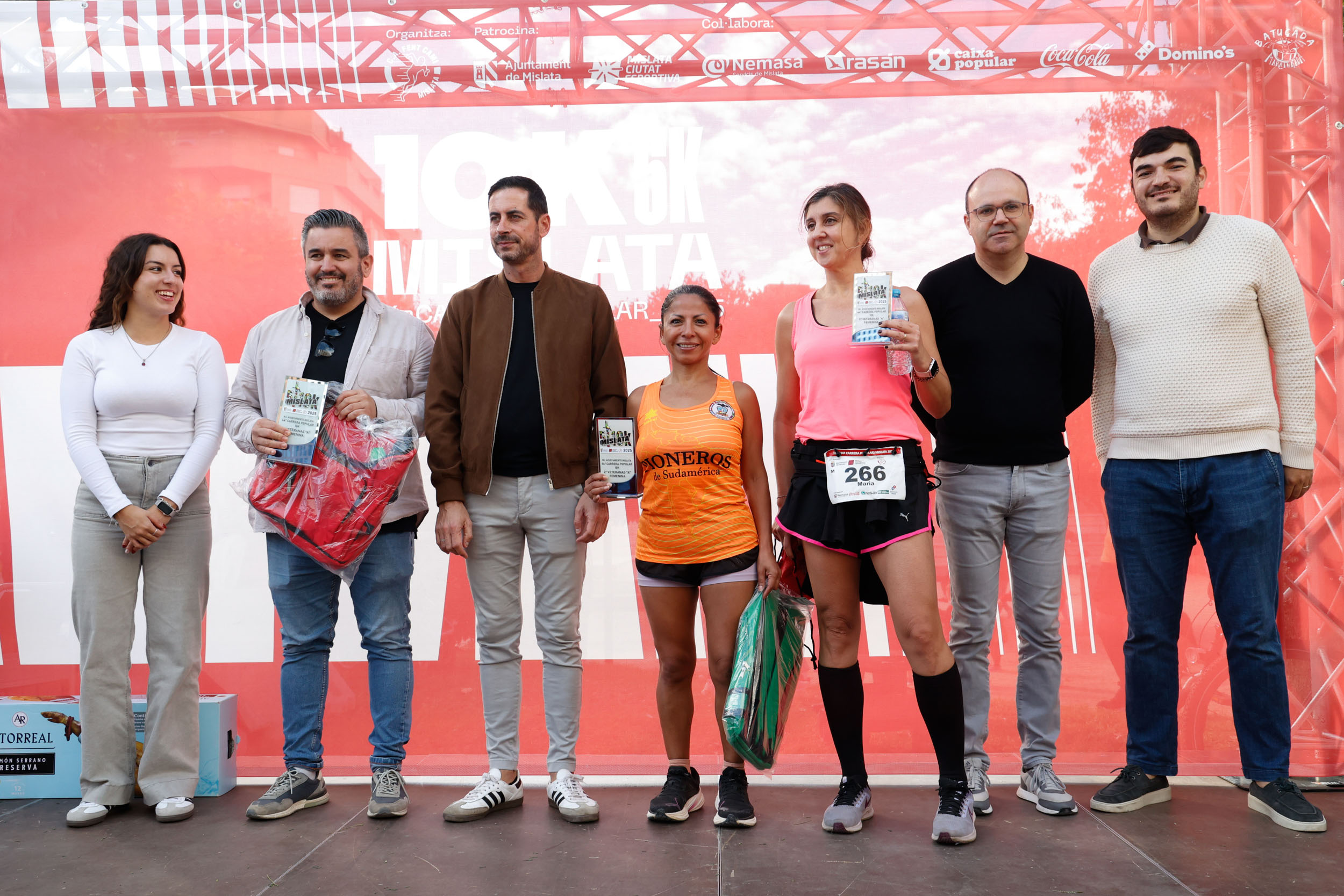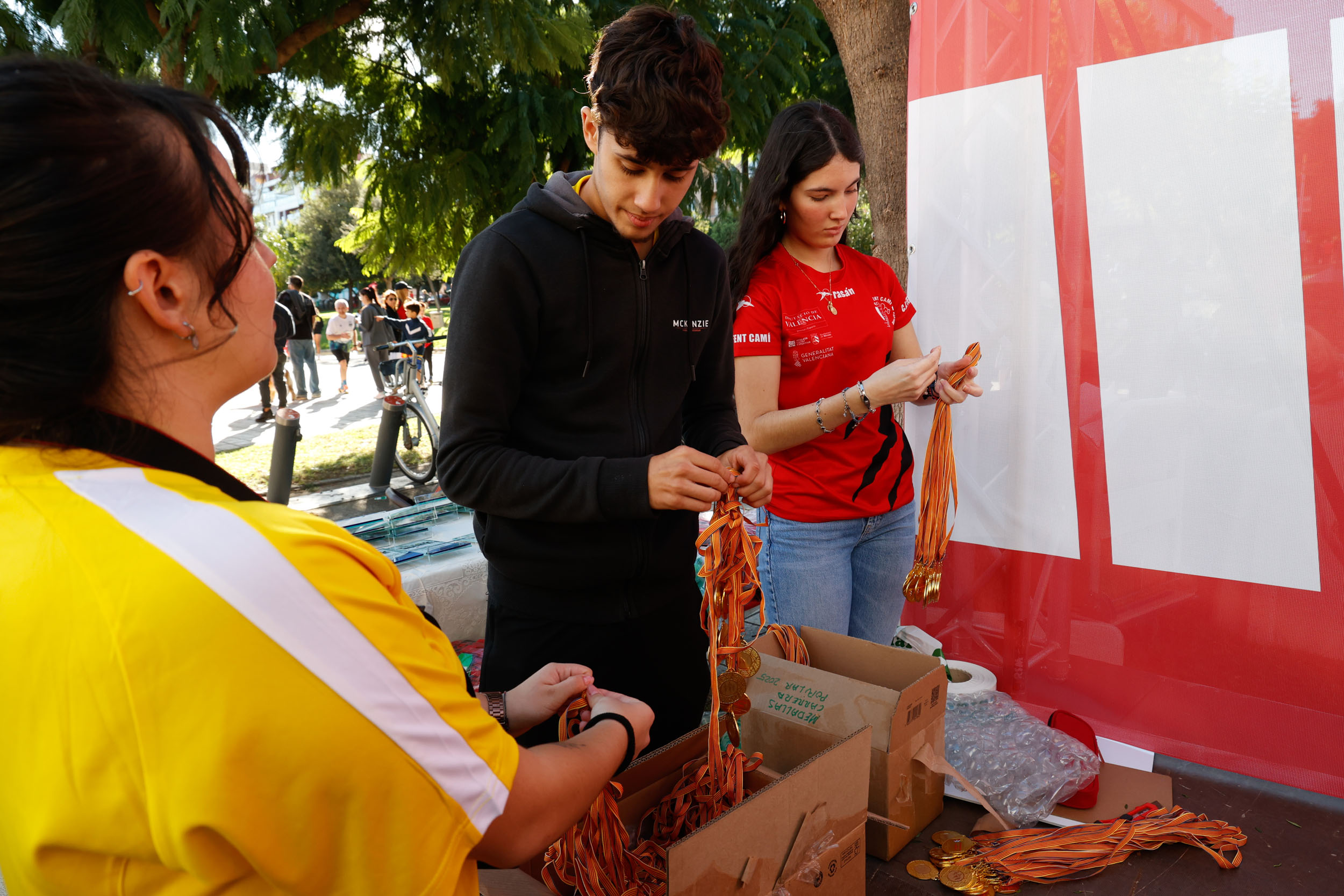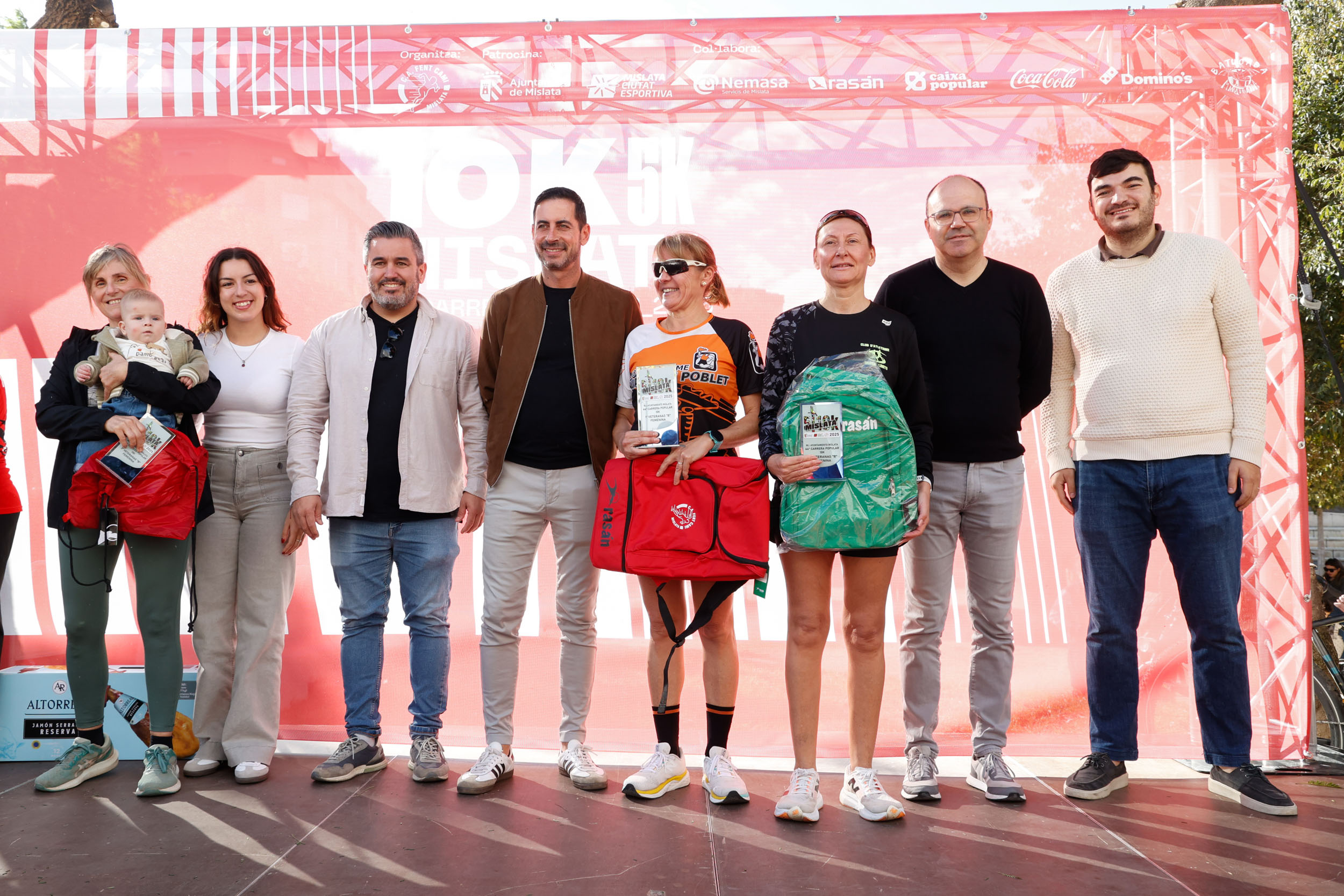 La organización culminó la jornada con la entrega de medallas y obsequios aportados por entidades y empresas colaboradoras a las categorías sénior, veterana y júnior. El acto de reconocimientos reunió al alcalde, Carlos Fernández Bielsa; el concejal de Deportes, Toni Arenas; el edil de Educación, Alfredo Català; y la concejala de Infancia, Jenifer Nieves. También participó Hamu, en representación de la oficina de Caixa Popular en Mislata, junto a la presidenta del Club Atletismo Fent Camí, Inmaculada Francisco.