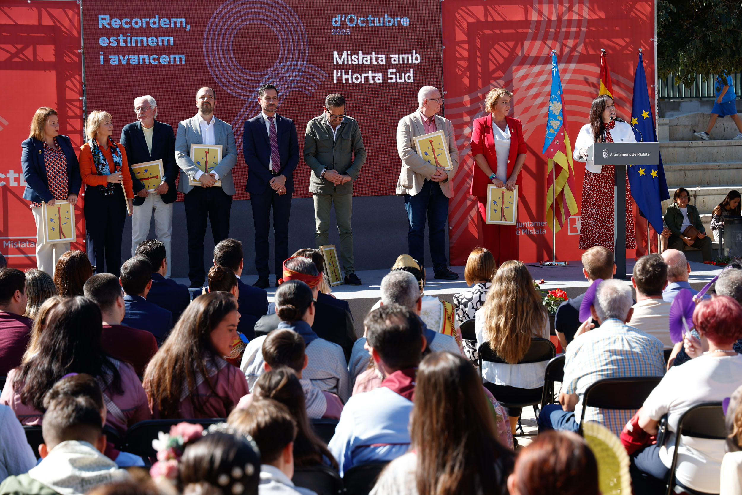 El acto institucional de este año, además, de forma extraordinaria, rindió un sentido homenaje a los municipios de la comarca de l’Horta Sud que sufrieron los efectos devastadores de la DANA hace ahora casi un año. Varios alcaldes y alcaldesas de estos municipios vecinos asistieron al acto y recibieron el aplauso y el abrazo de afecto de toda Mislata.