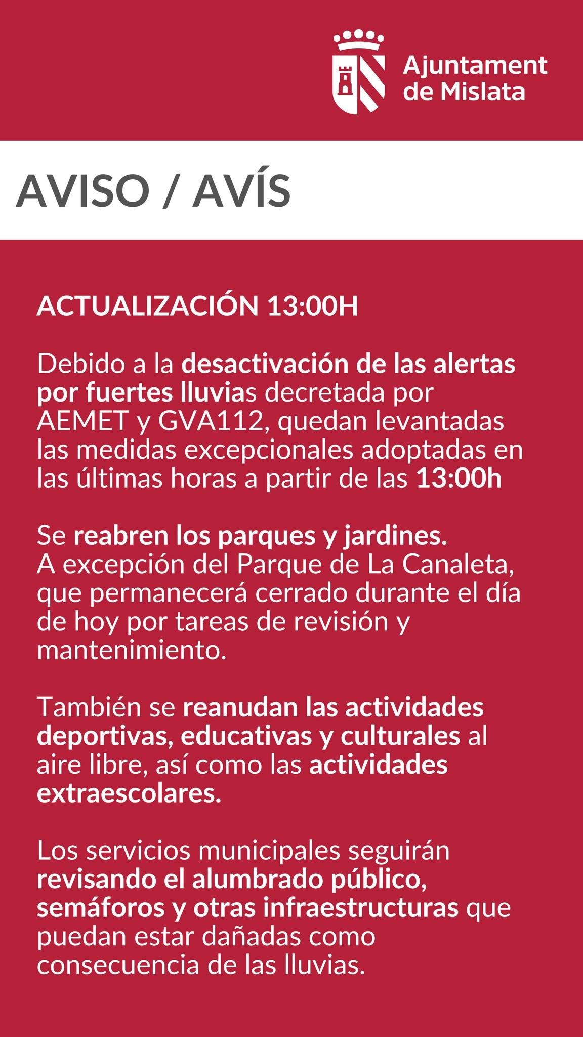 Debido a la desactivación de las alertas por fuertes lluvias decretada por AEMET y GVA112, quedan levantadas las medidas excepcionales adoptadas en las últimas horas a partir de las 13.00 h.