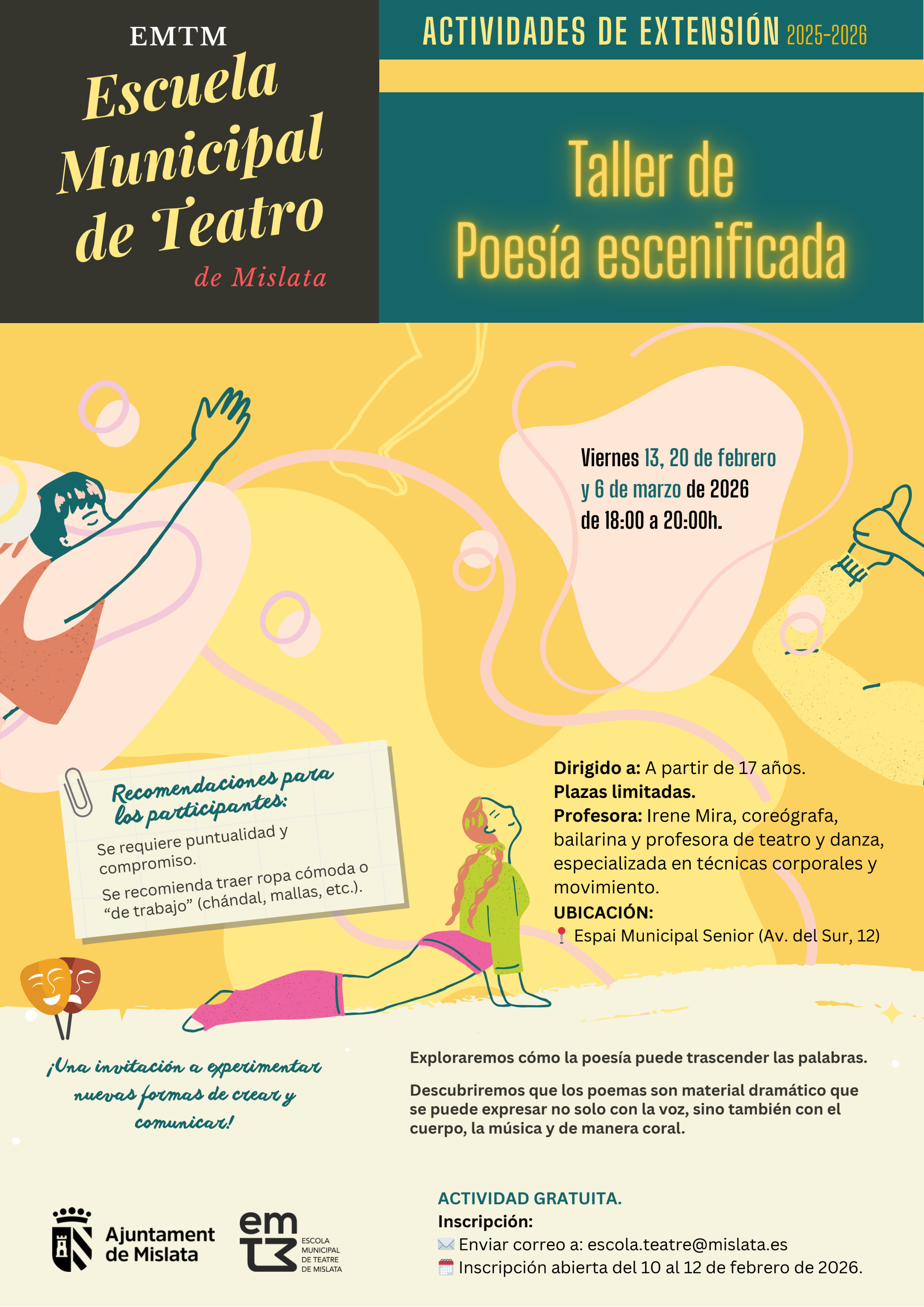 Inscripcions gratuïtes: del 10 al 12 de febrer (escola.teatre@mislata.es)