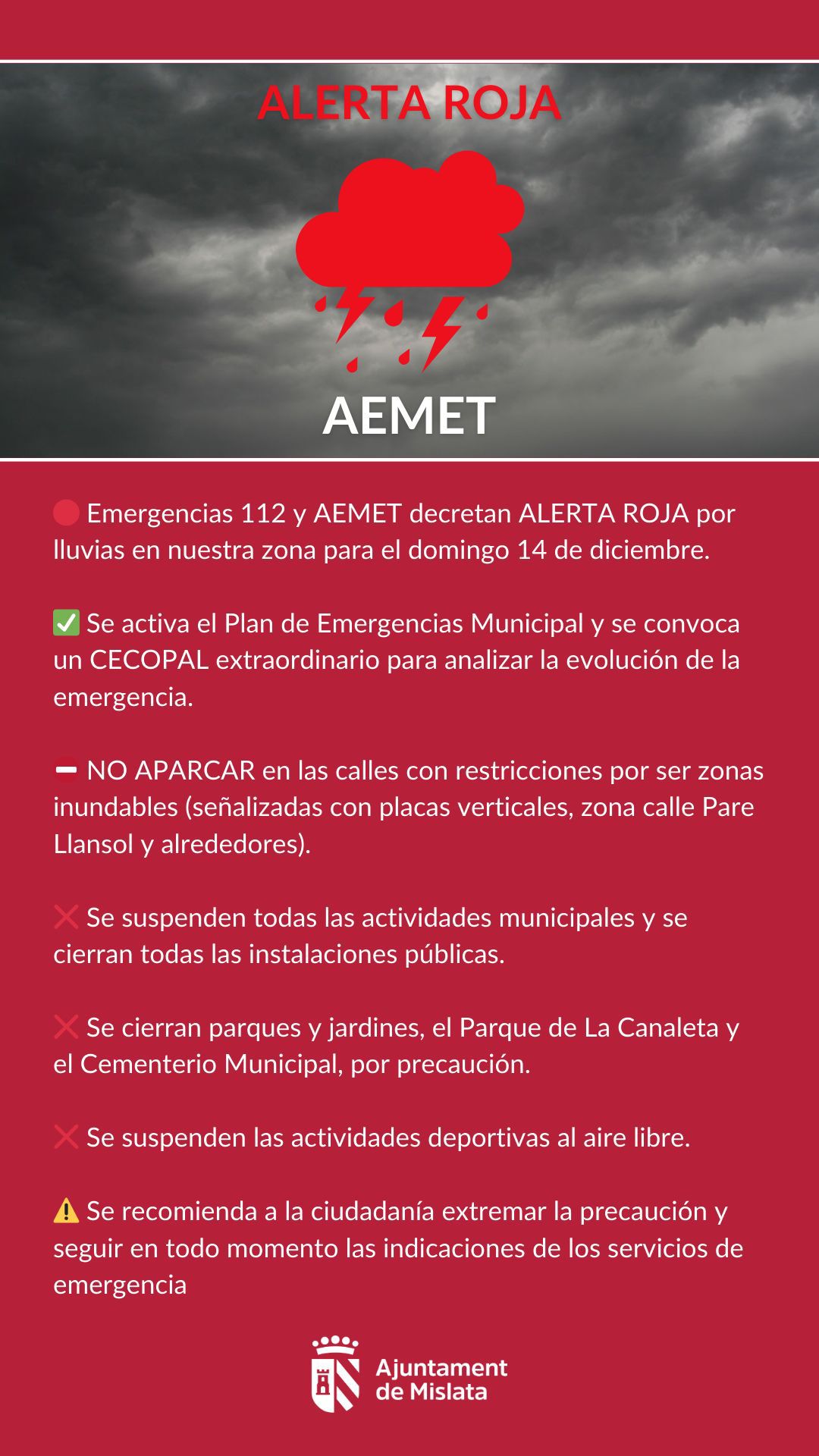 Emergències 112 i AEMET decreten ALERTA ROJA per pluges en la nostra zona per al diumenge 14 de desembre a partir de les 12h.
