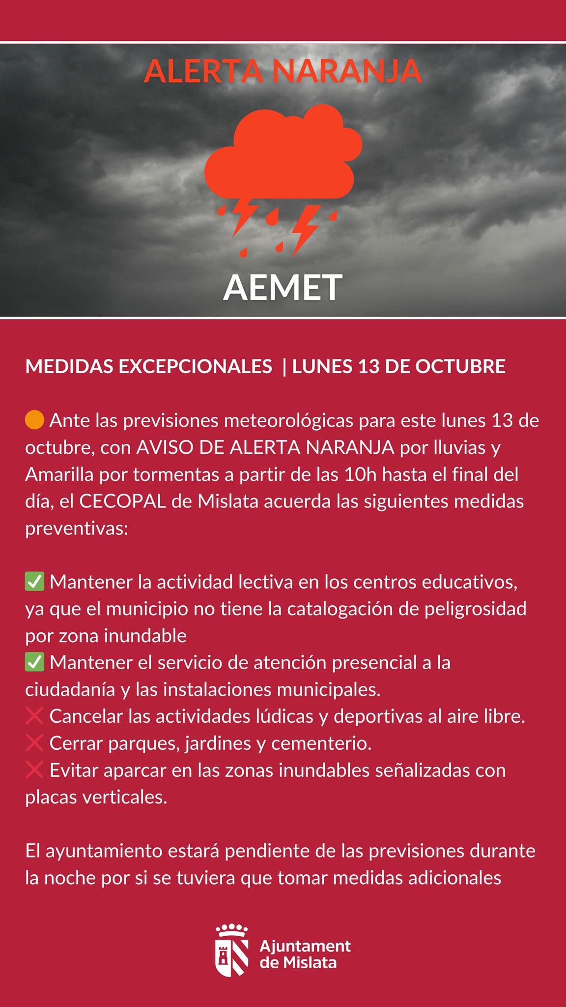 Davant les previsions meteorològiques per a aquest dilluns 13 d'octubre, amb AVÍS D'ALERTA TARONJA per pluges i Groga per tempestes a partir de les 10h fins al final del dia, el CECOPAL de Mislata acorda les següents mesures preventives: