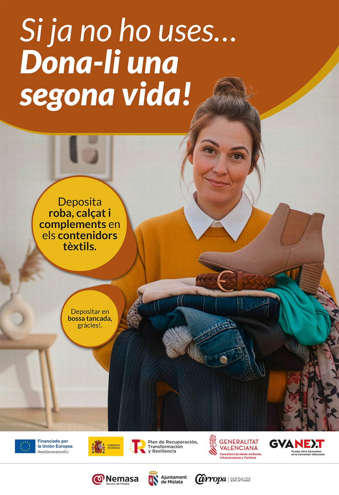 Campanya informativa de l'Ajuntament de Mislata juntament amb NEMASA i la col·laboració de Arropa per a reforçar la separació i gestió diferenciada dels residus tèxtils, amb l'objectiu de conscienciar a la ciutadania de la importància de separar i aclarir quins residus poden depositar-se en el contenidor roig i quins no.